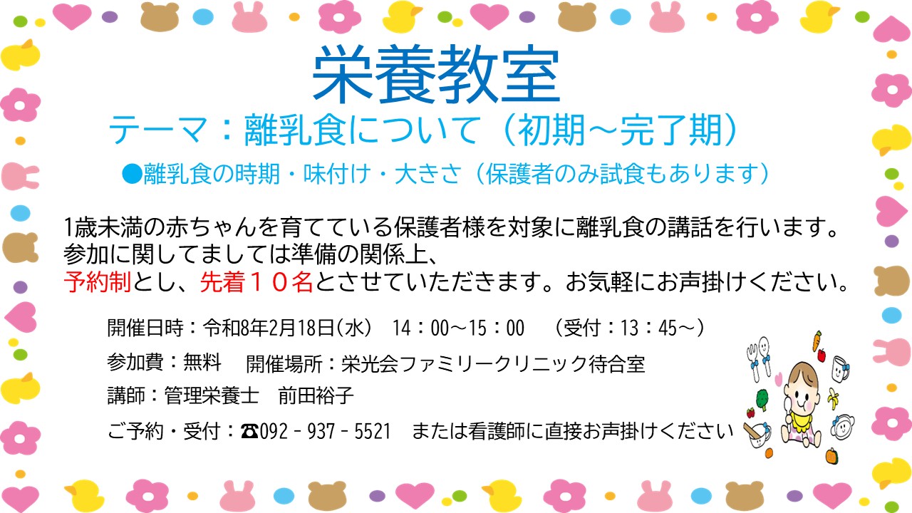 栄光会ファミリークリニック トップ > 栄光会ファミリークリニックニュース > 2/18(水) 栄養教室【テーマ:離乳食について】のご案内
