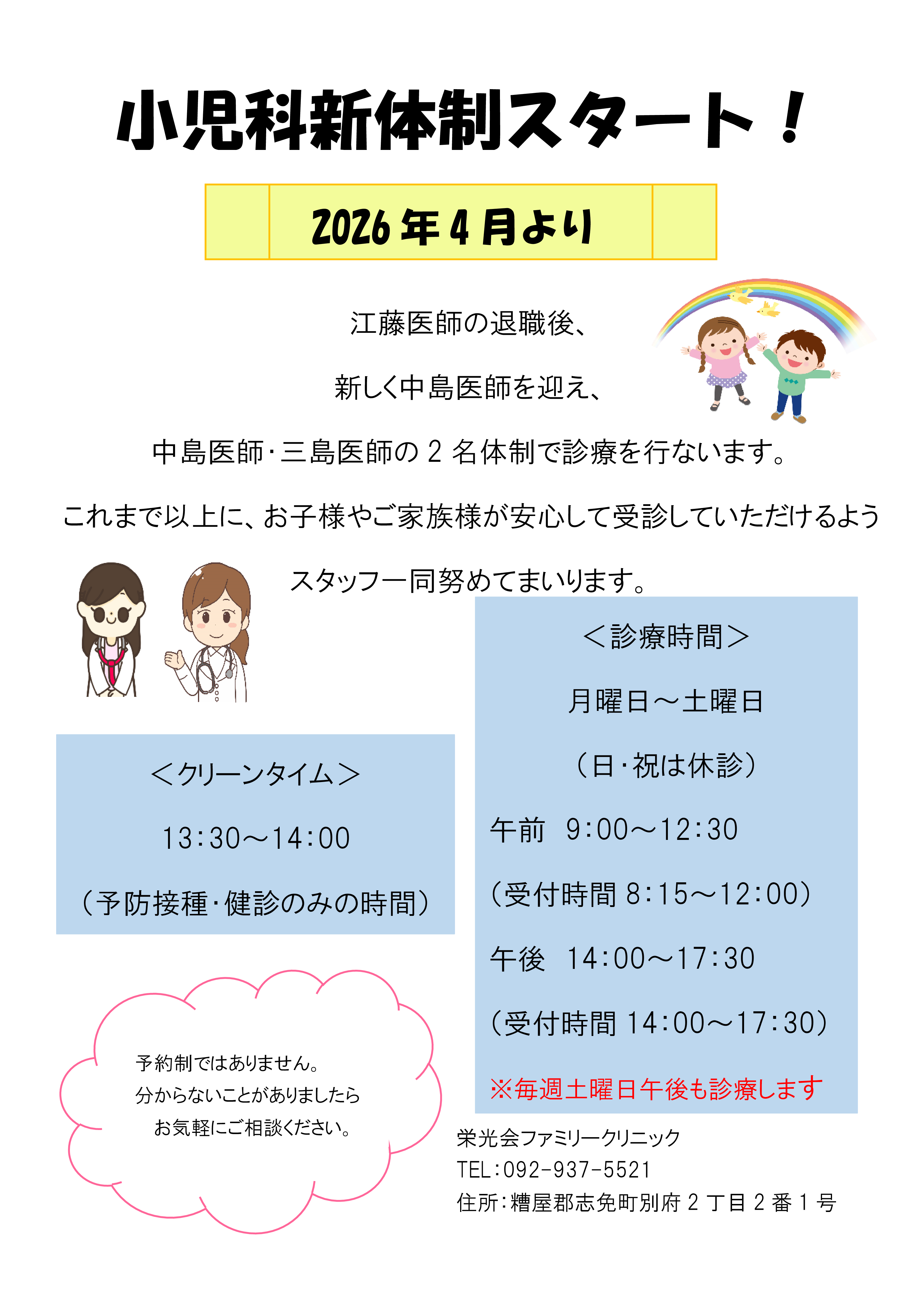 栄光会ファミリークリニック トップ > 栄光会ファミリークリニックニュース > 4月からの小児科新体制について